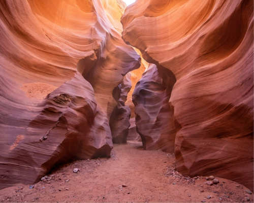 Antelope Canyon is a slot canyon carved into Navajo sandstone by flash floods over thousands of years. Water rushing through narrow cracks slowly sculpted the smooth, flowing walls that look almost like waves frozen in stone.