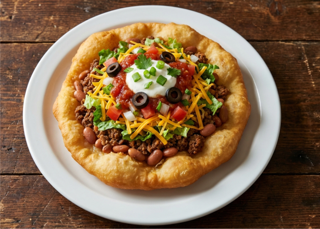 Navajo Taco – fry bread topped with beans, beef, lettuce, cheese, and tomatoes